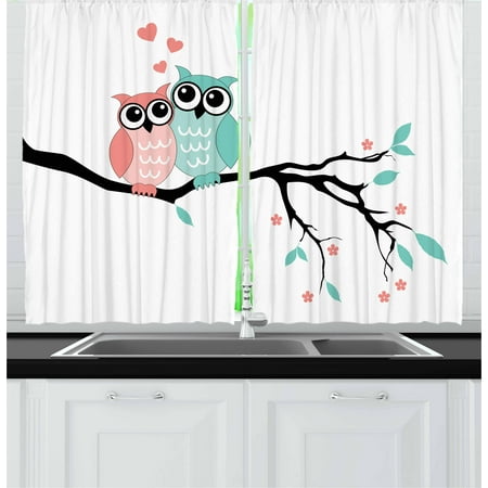 Teal And White Curtains 2 Panels Set Cute Owl Couple Sitting On